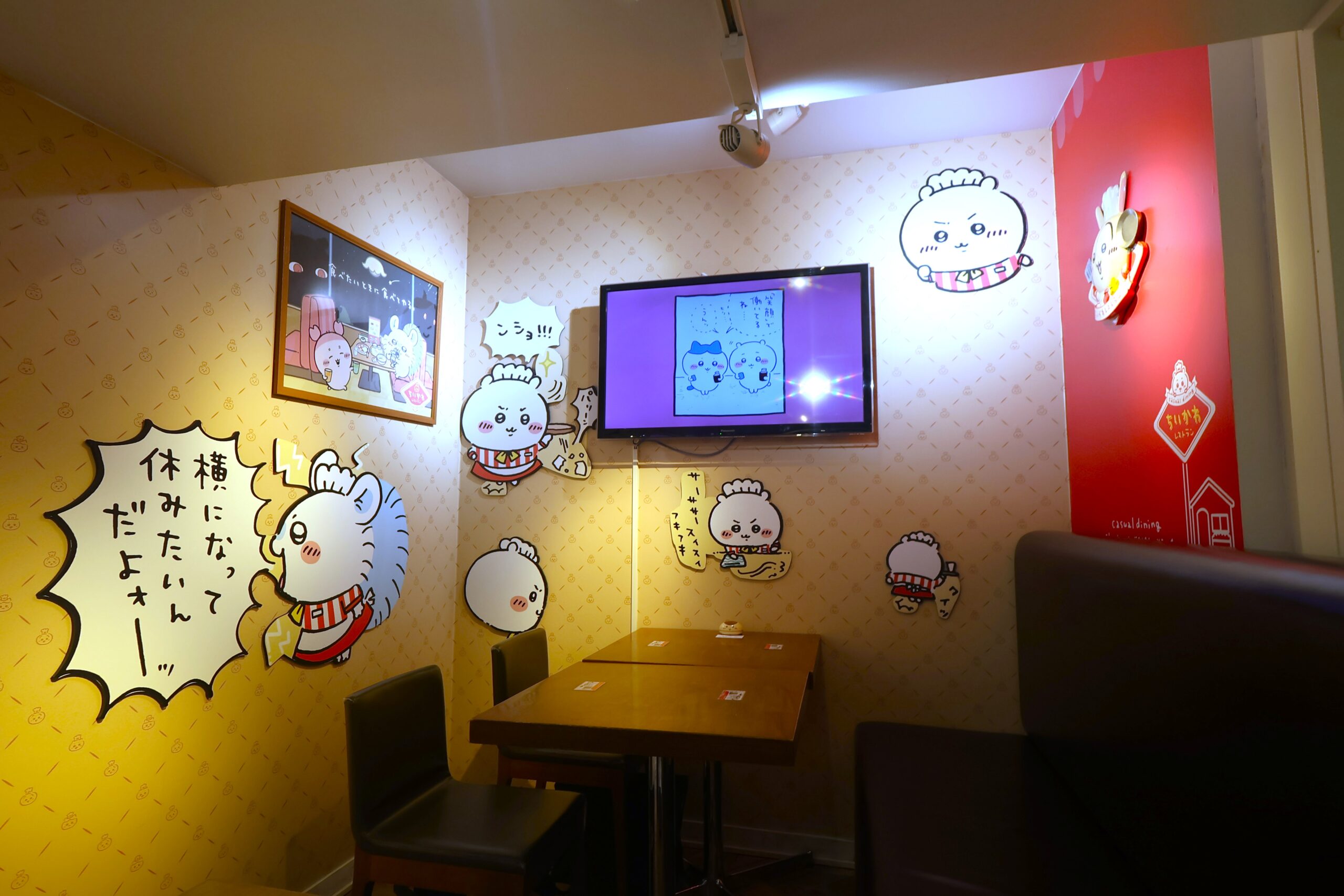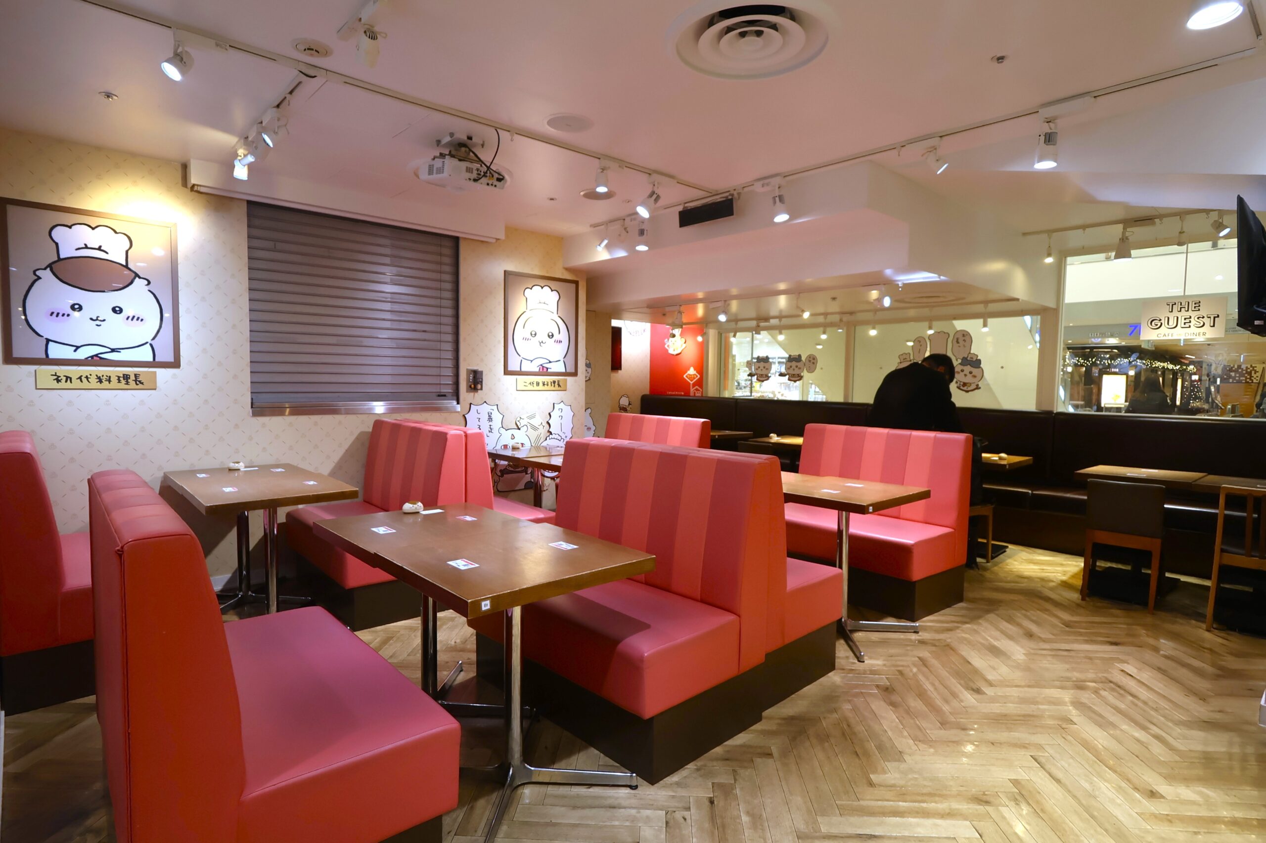 店舗へ入るとまず目に入るのは、赤を基調とした内装と「ちいかわ」装飾の数々。店内のあちこちに“シェフ”をモチーフにしたPOPやイラストが配置されており、キャラクターたちが客を出迎えてくれるような温かい雰囲気だ。