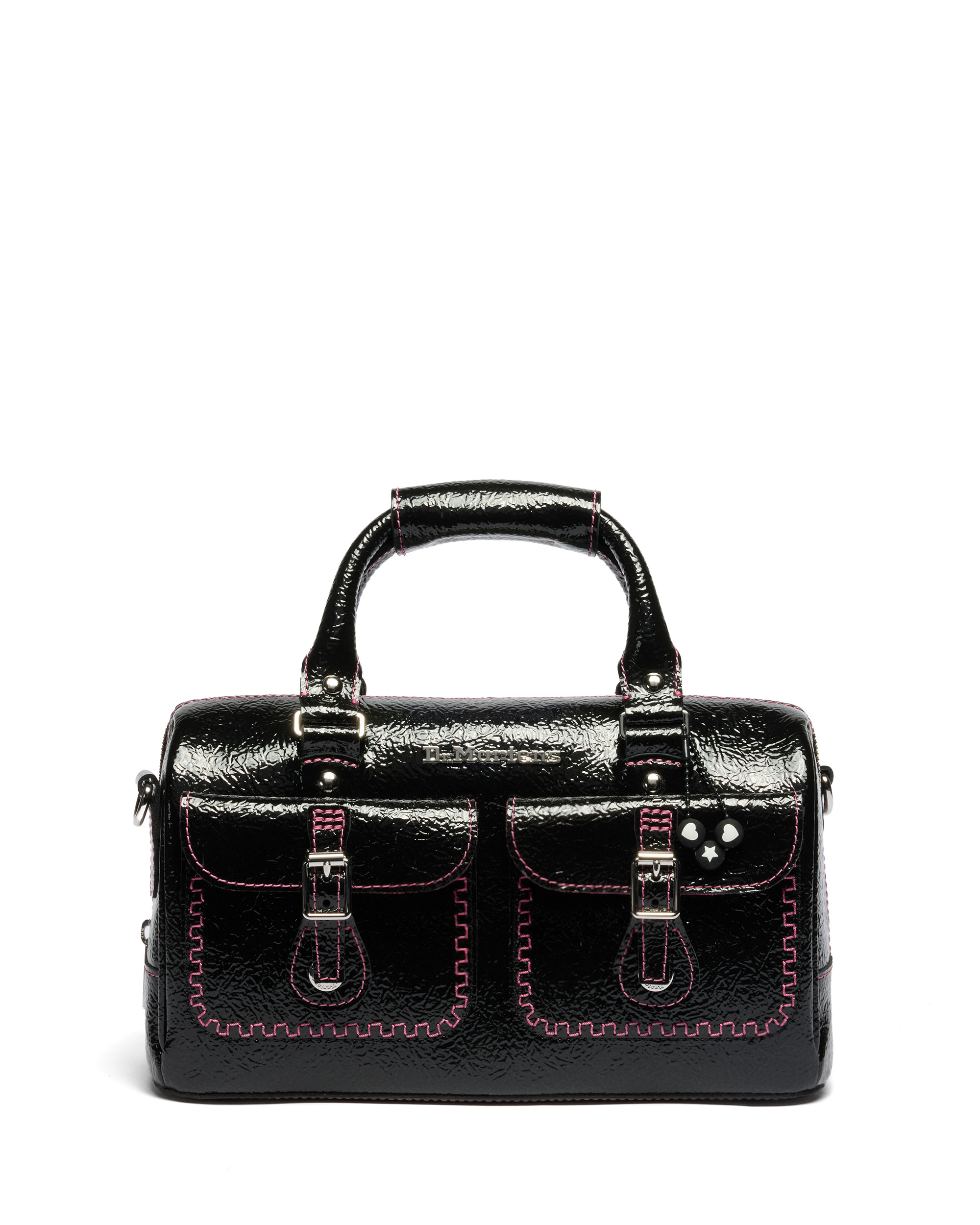 ブラックパテントレザーを使用したトップハンドルバッグは、ピンクのステッチングと、シリコンビーズのチャームがポイント。
