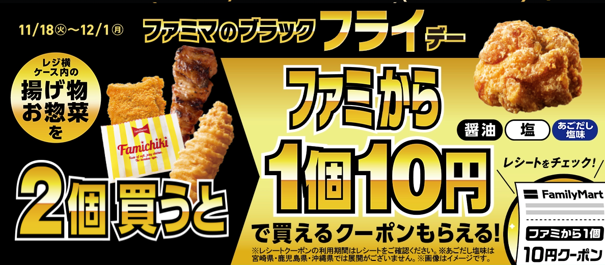 ファミマの「ブラック“フライ”デー」は、11月18日(火)〜12月1日(月)まで、レジ横のケース内の揚げ物・お惣菜を2個買うと「ファミからが1個10円で買える」クーポンがもらえる!さらに、ファミペイ払いならアプリ上で“もう1枚”クーポンがもらえる。
