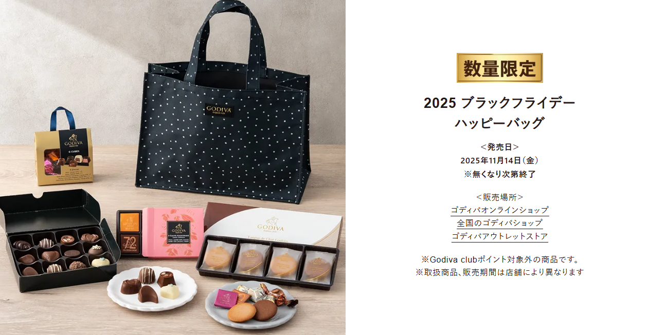 ゴディバ ジャパン株式会社(東京都港区)はゴディバ「2025 ブラックフライデー ハッピーバッグ」を、2025年11月14日(金)より、全国のゴディバショップ、ゴディバ アウトレットストアおよびゴディバ オンラインショップにて各店数量限定販売する。
