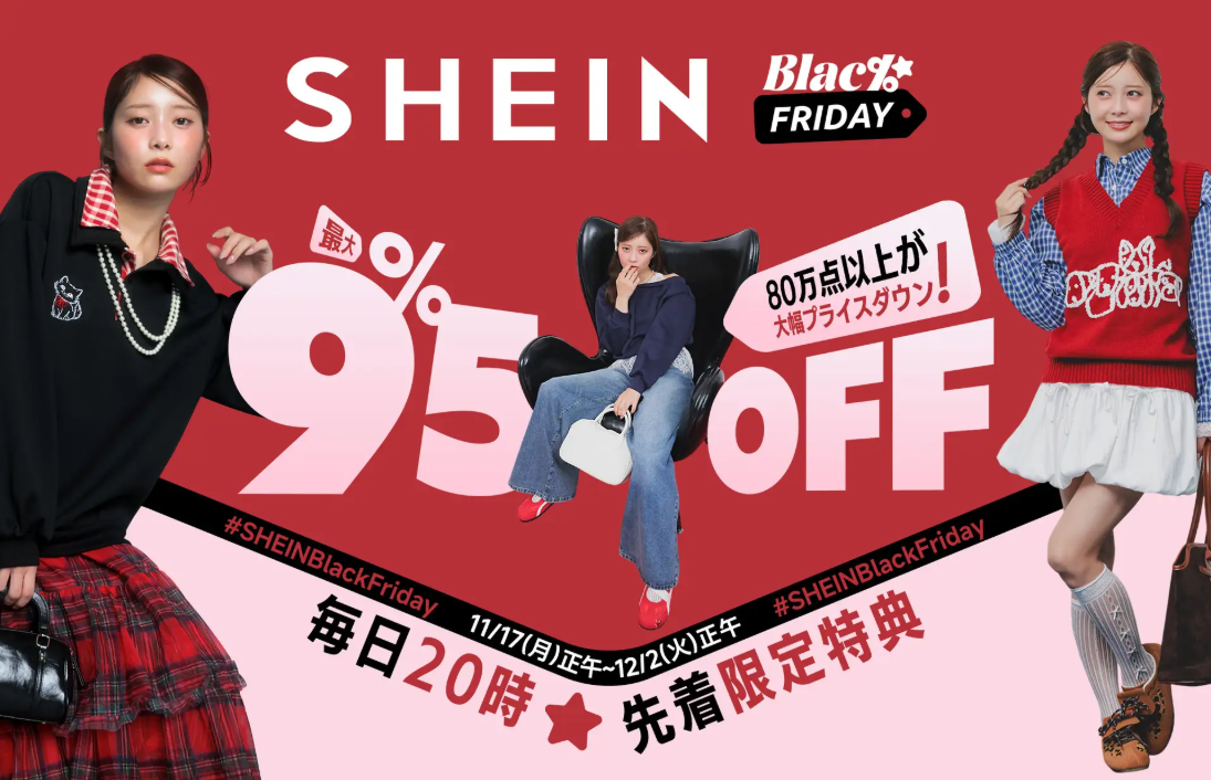 SHEINが、年に一度のビッグセール「SHEIN BLACK FRIDAYセール」を、2025年11月17日(月)12:00~12月2日(火)12:00の期間で開催します。 今回は2 部構成で、11月17日(月)~11月24日(月)が先行セール、11月24日(月)~12月2日(火)が本セール。対象商品は100万点以上で、最大95%オフの大幅値下げが実施されます。また、毎日20:00~の時間限定50%オフや10,000円オフクーポン配布、11月28日(金)の買い上げ6,000円以上で無料ギフトプレゼントなど、内容も充実。ファッション・ライフスタイルを扱うグローバルブランドならではの、旬なアイテムを“お得に手に入れる”チャンスです。
