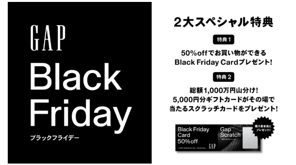 さらにブラックフライデー期間中、全国のGapストアと公式オンラインストア、Gap Outletストアで購入されたお客様全員が参加できるスクラッチ抽選を実施。総額1,000万円分、過去最大の当選者となる2,000名のお客様にギフトカードが当たるスクラッチ抽選は、当たりが出ると5,000円分のギフトカードをプレゼント。