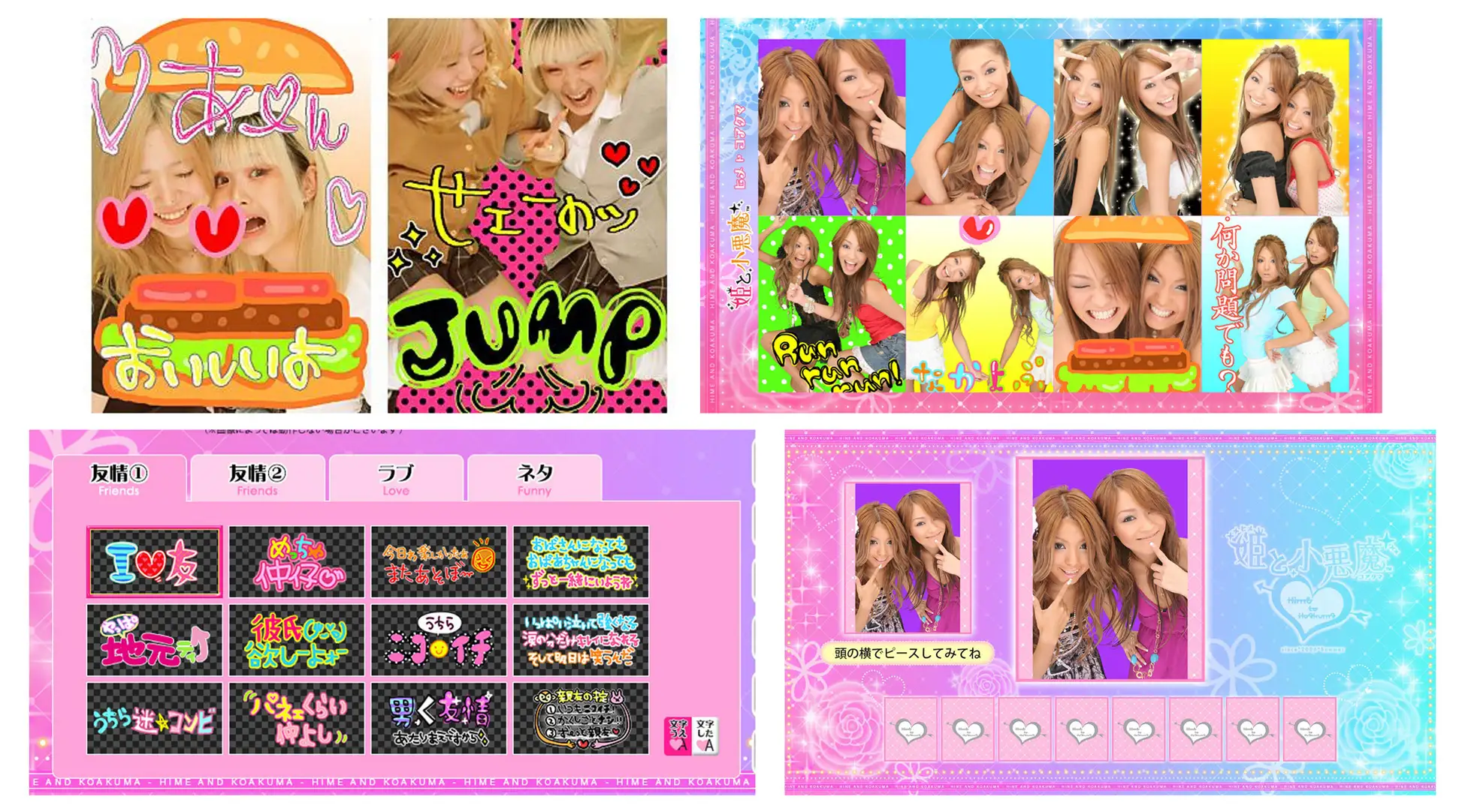 平成中期に人気を博した“ギャル系”のプリ機。写りはやや粗めだが、フレームやスタンプがポップで大胆。りんごやハンバーガー風のフレーム、“めっちゃ仲仔”“うちらニコイチ”といったメッセージスタンプが懐かしさ全開だ。