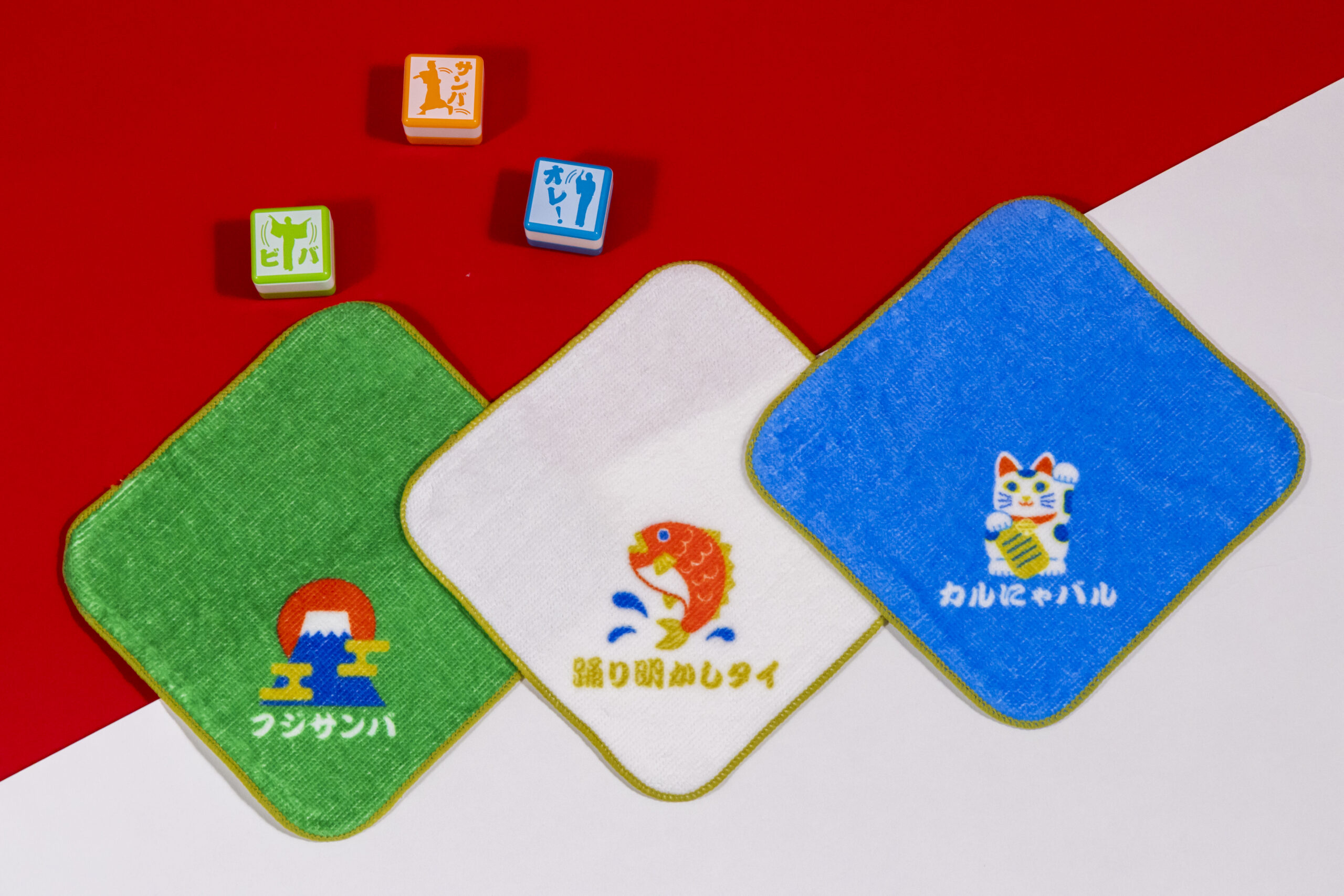 「マツケンサンバⅡ」の歌詞に合わせ「フジサンバ」「踊り明かしタイ」「カルにゃバル」がデザインされたハンドタオル。 - 踊るマツケンハンコ(全3種)