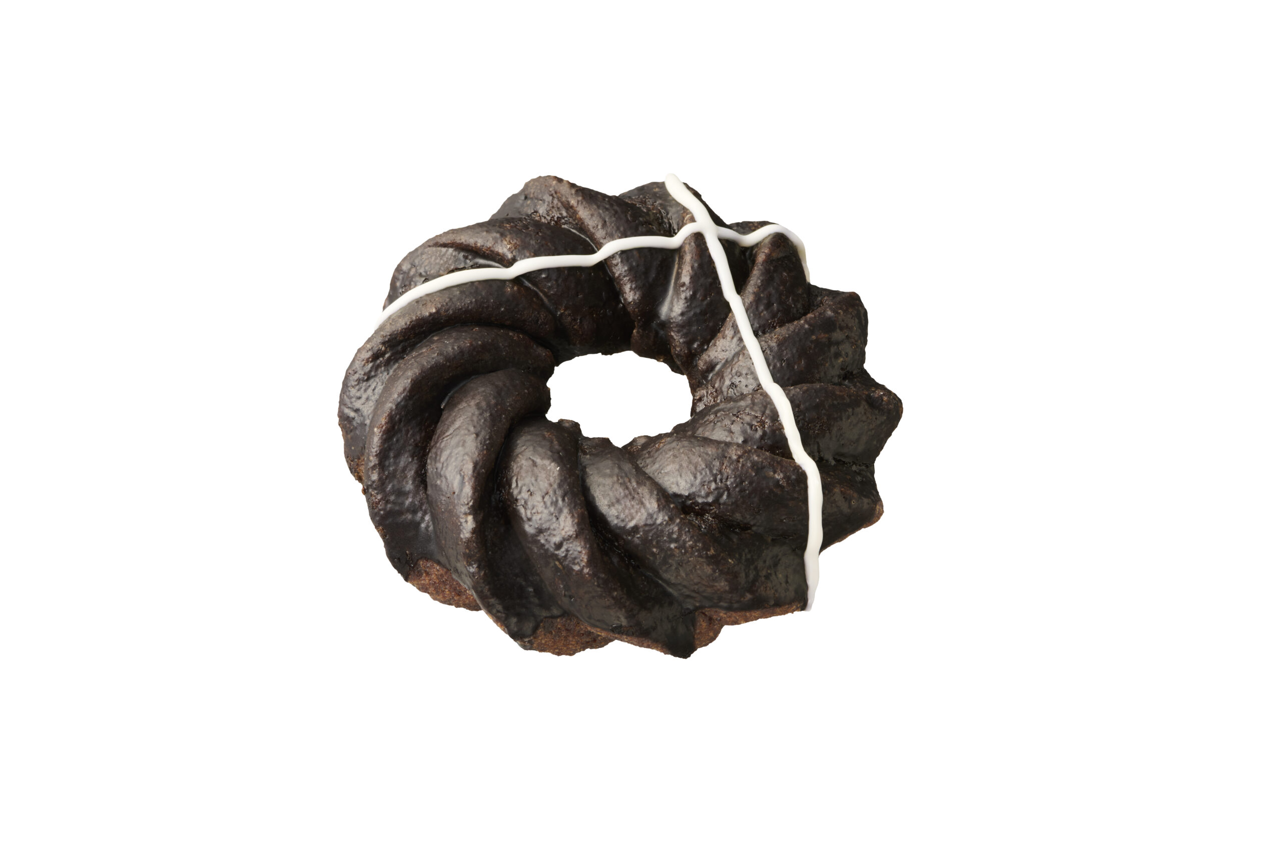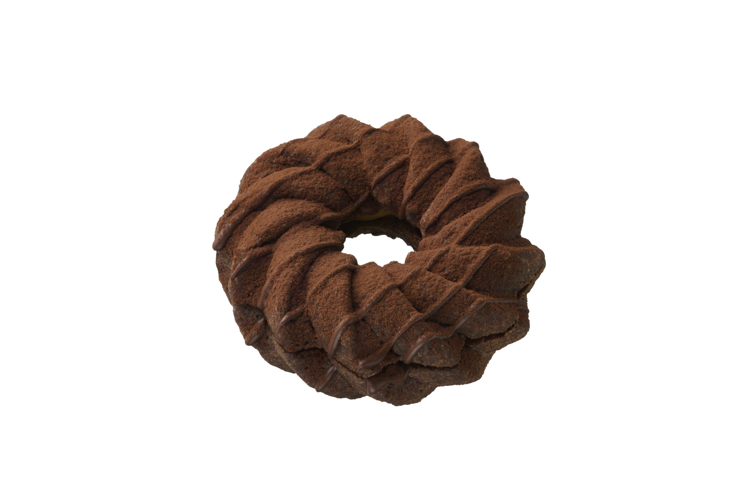トリュフショコラをイメージしたなめらかな食感のショコラドーナツ生地にガナッシュクリームとガナッシュホイップを重ね、チョコレートをコーティング。フレークチョコとココアパウダーをトッピングして仕上げました。