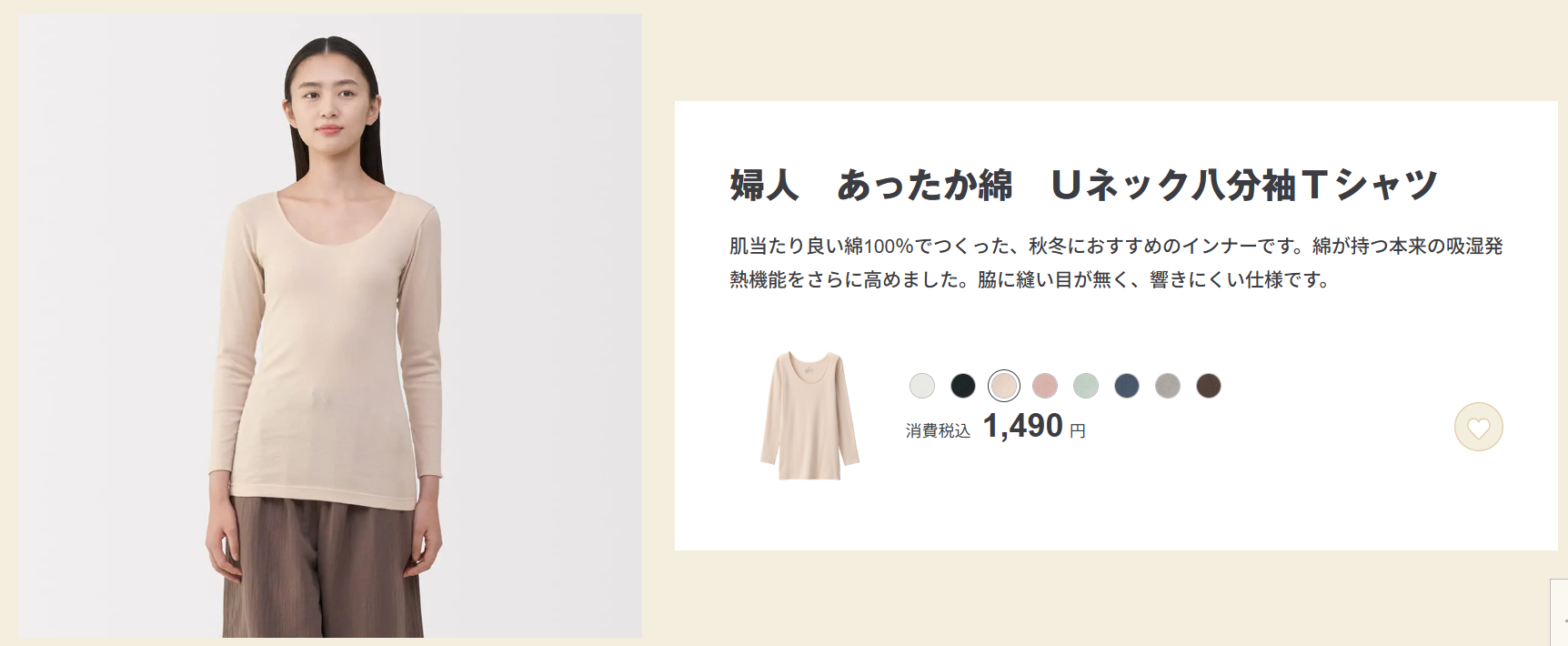 アパレル用品1位・婦人 あったか綿 Uネック八分袖Tシャツ(税込1,490円)