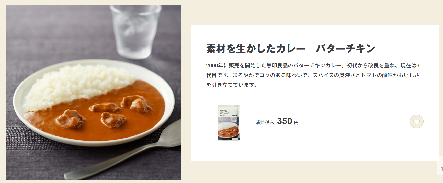 2009年に販売を開始した無印良品のバターチキンカレー。初代から改良を重ね、現在は6代目です。まろやかでコクのある味わいで、スパイスの奥深さとトマトの酸味がおいしさを引き立てています。