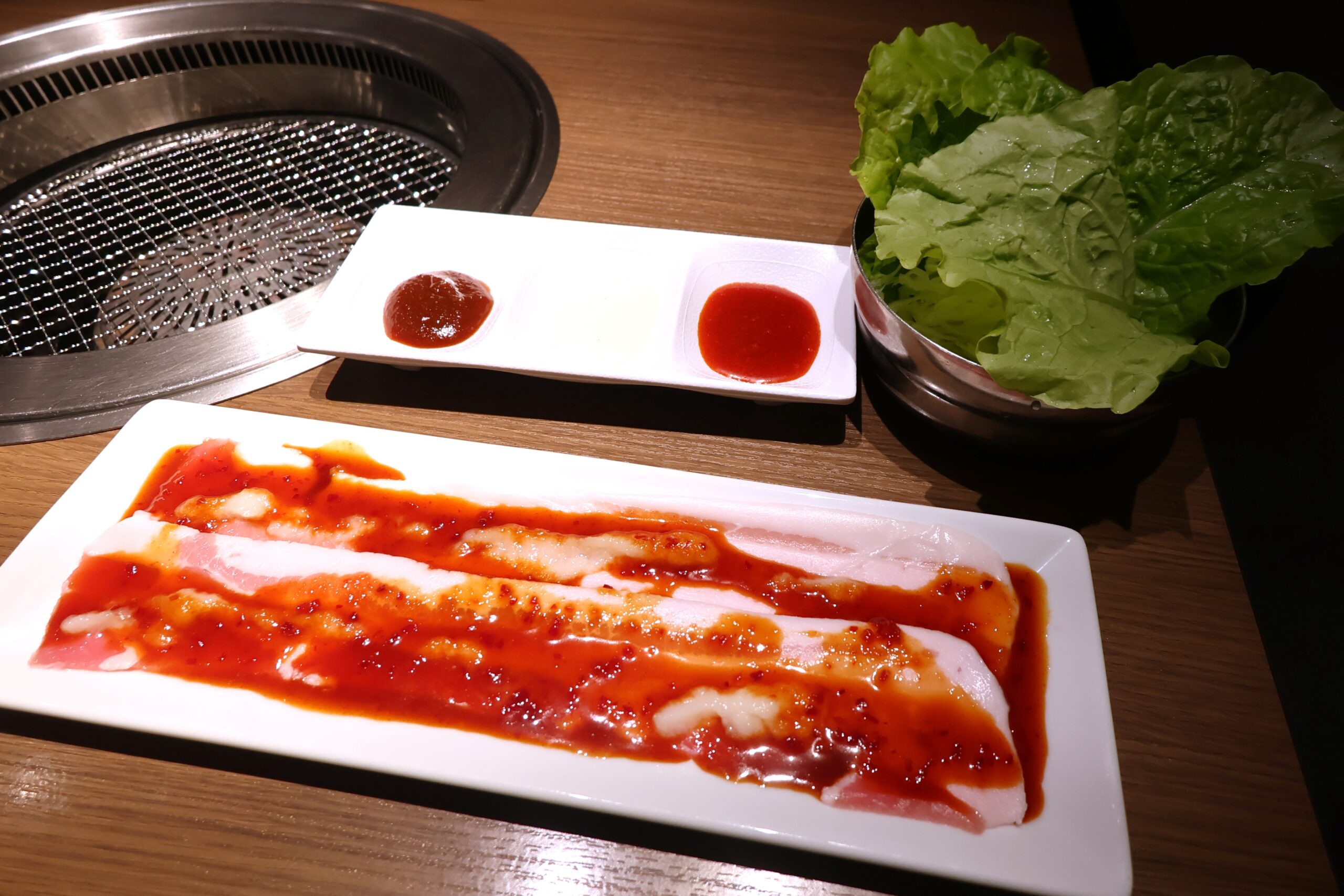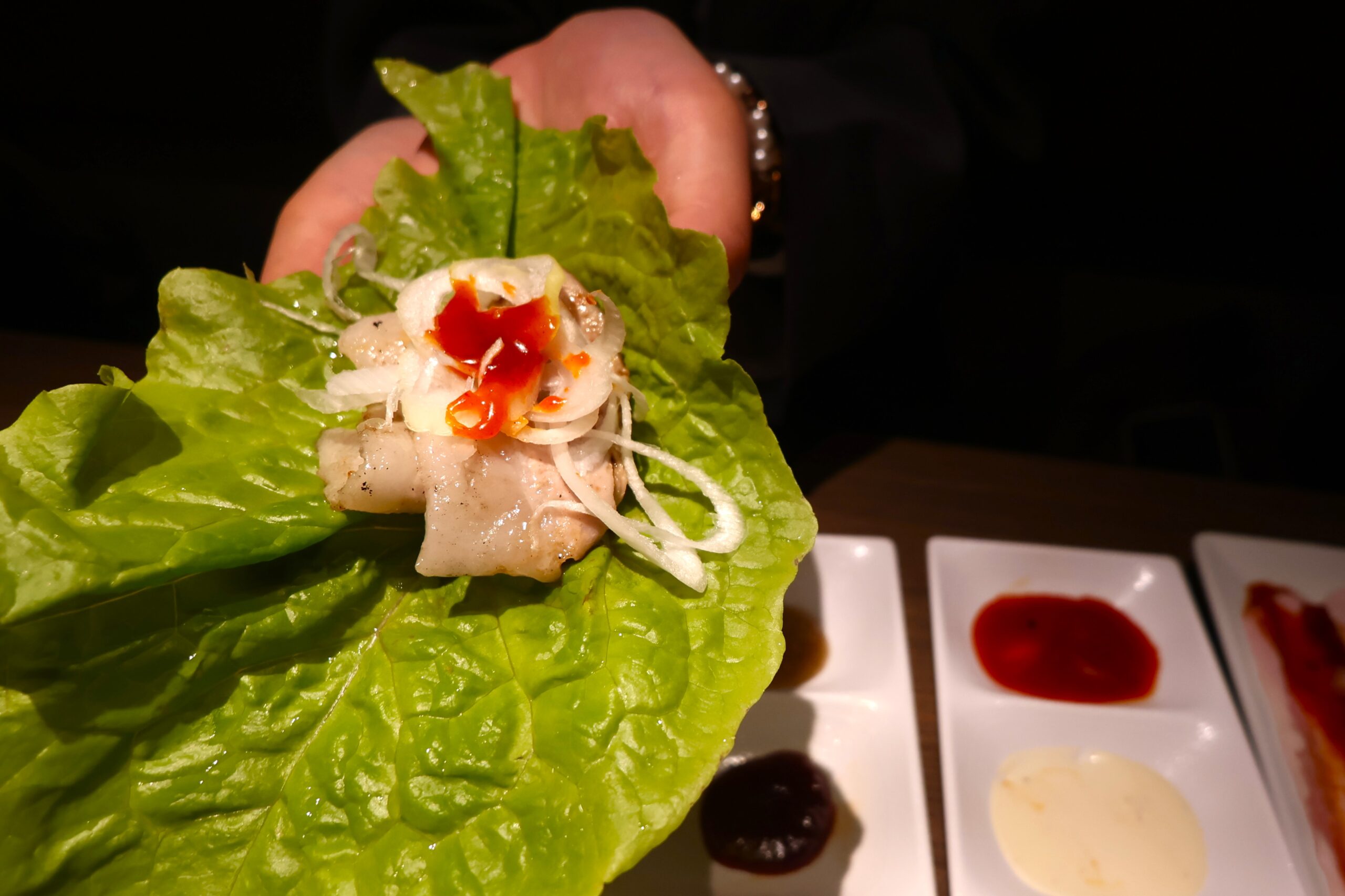 「本場では厚めのお肉を使用するのが主流だが、牛角では七輪の下に美味しい油が落ちてしまう。さっと焼けるよう、薄めの豚カルビを採用した。サンチュに合わせてお好きな味付けでお召し上がりいただきたい」と解説した。個人的には、タレはコチュマヨが一番好みであった。サンチュにシソを合わせるとさっぱり、いろいろな組み合わせで味変ができて飽きずに食べられた。