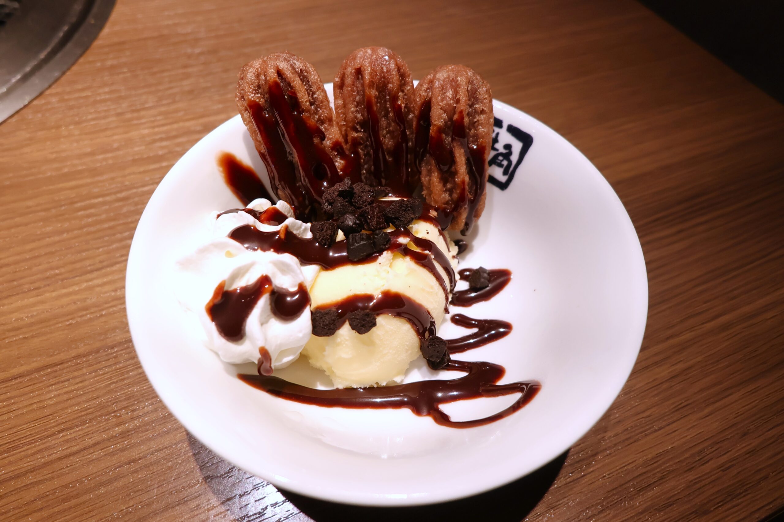 デザートには、サクサク×ひんやりの食感が楽しい「チョコチュロスクッキーバニラ」が登場。七輪で炙ったアツアツのチュロスに、冷たいバニラアイスが溶け合う瞬間はまさに至福。トッピングのクッキークランチがアクセントになり、最後まで飽きずに楽しめる。甘めの仕上がりで、特に女性人気が高まりそうなデザートだった。