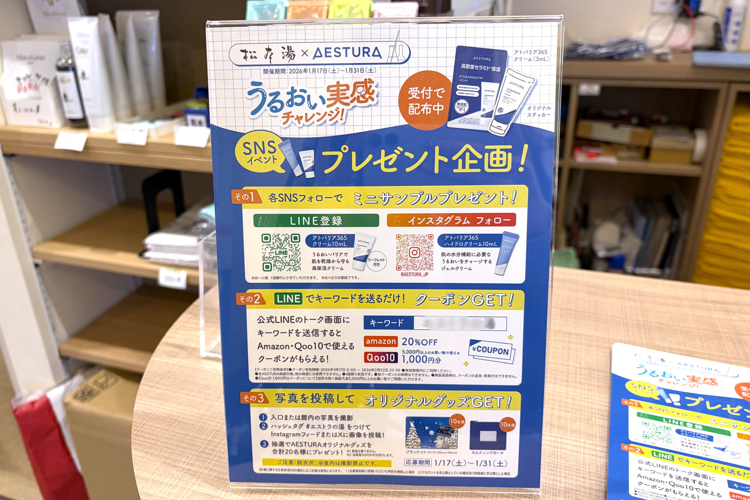 また、SNS投稿キャンペーンでは、抽選でAESTURAオリジナルブランケットやキルティングポーチが当たる企画も実施。銭湯という公共空間ならではの撮影ルールに配慮しつつ、ブランド体験をSNSで広げる設計が丁寧に作り込まれている。