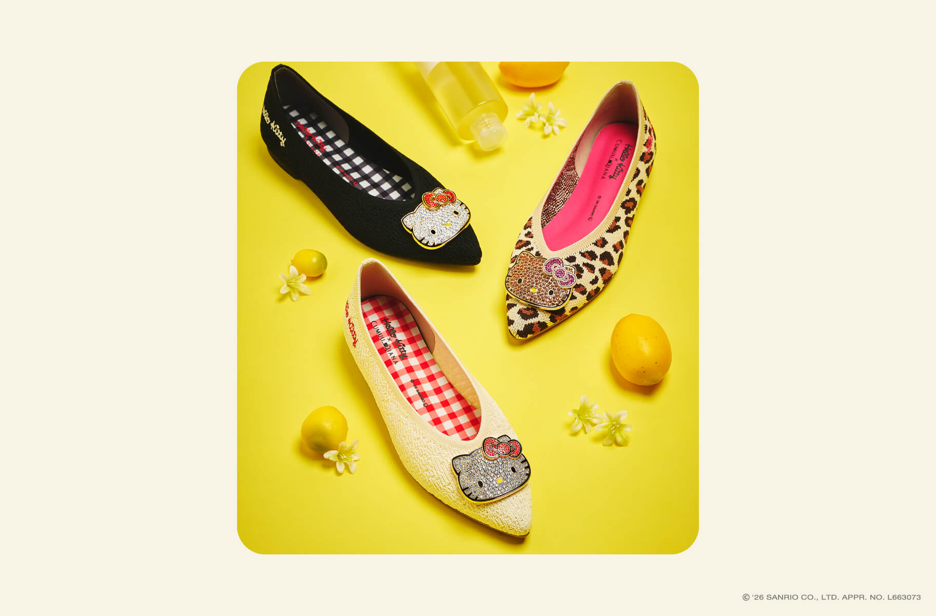 キラキラのハローキティバッジがポイントのシューズは、レオパード柄含めて3種類展開。それぞれ中敷きのカラーも異なり、コーデに合わせて楽しめる。
