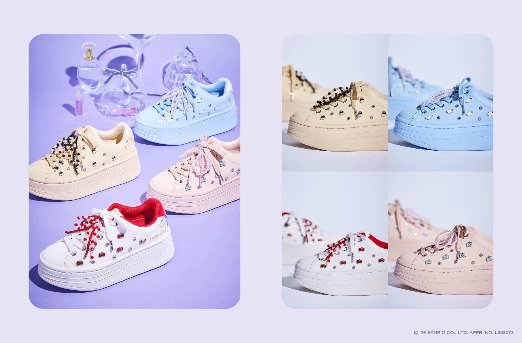 ハローキティをモチーフにしたギンガムチェックやレオパード柄を使用した、今回のコラボを象徴する一足。