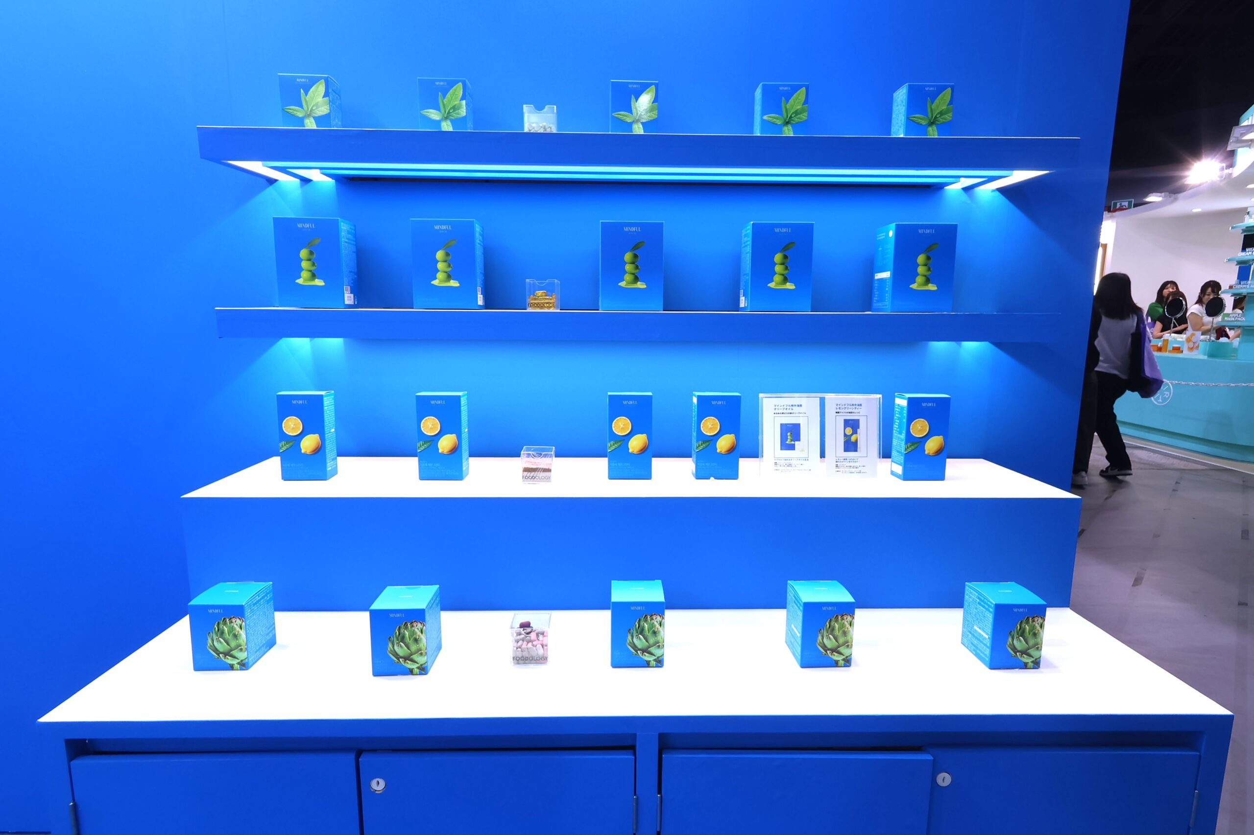 ここではコレオロジーシリーズの「赤」をイメージしたブースと、地中海産オリーブオイルを使用した新商品マインドフルシリーズの「青」をイメージしたブースの、2つに分かれており、それぞれの違いを楽しめた。
