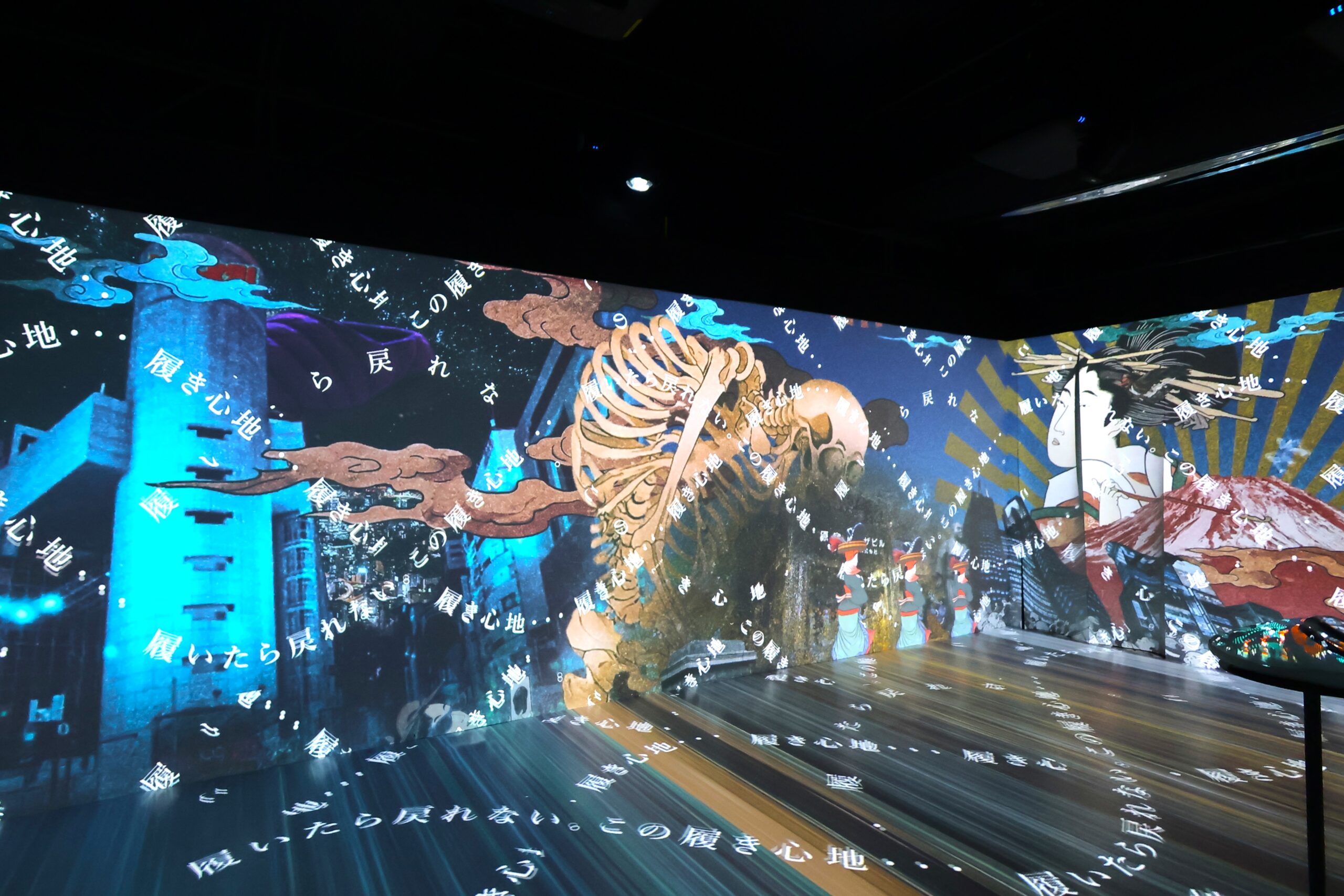 地下の会場へ足を踏み入れた瞬間、照度を抑えた空間と不穏さを感じさせる音響が来場者を包み込む。壁面や床、天井にはプロジェクションマッピングや映像演出が施され、現実と虚構の境界が曖昧になるような感覚に。