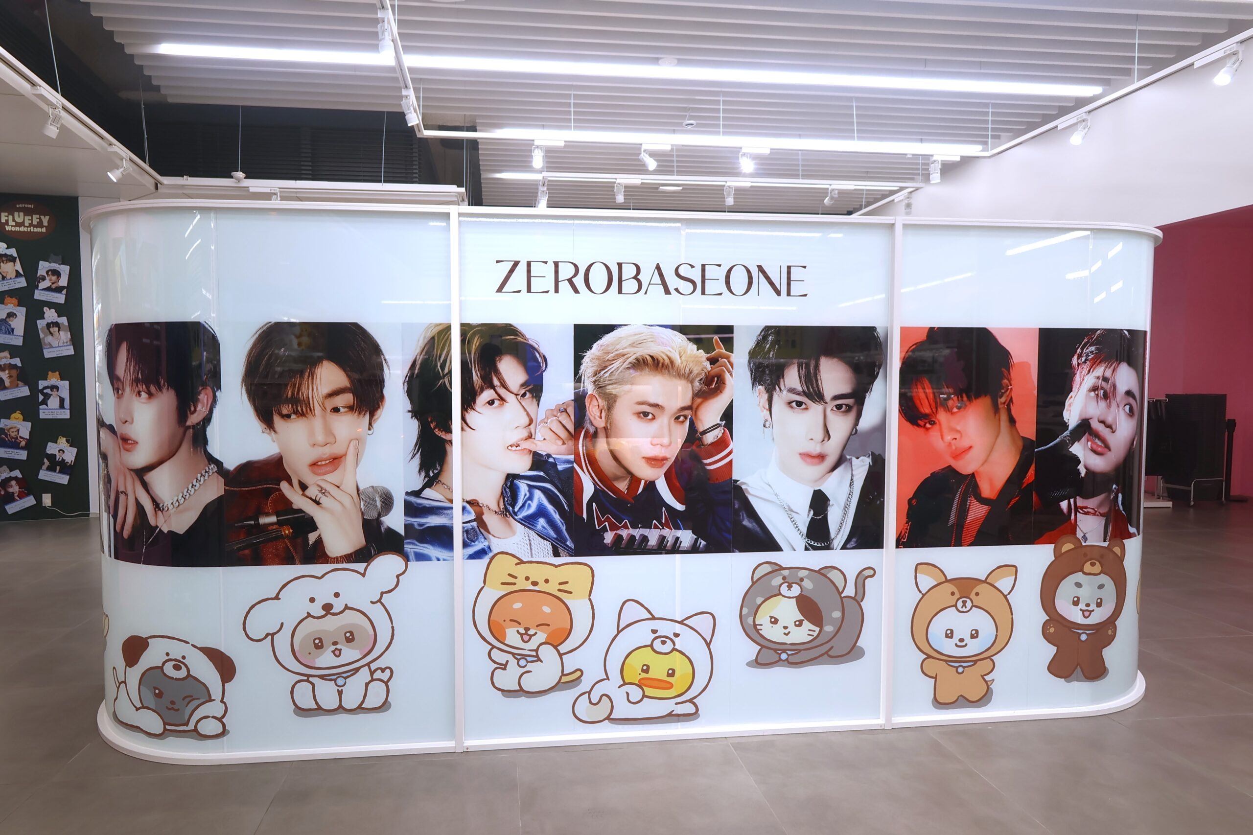 会場となる LINE FRIENDS SQUARE SHIBUYAの2Fフロアは、入るとすぐにzeroniの世界に包まれていた。テーマである“FLUFFY Wonderland”を象徴するパステルカラーの装飾が随所に施され、本人の映像が流れるとともに、キャラクターたちのイラストやメンバーのパネルが空間全体に広がる。